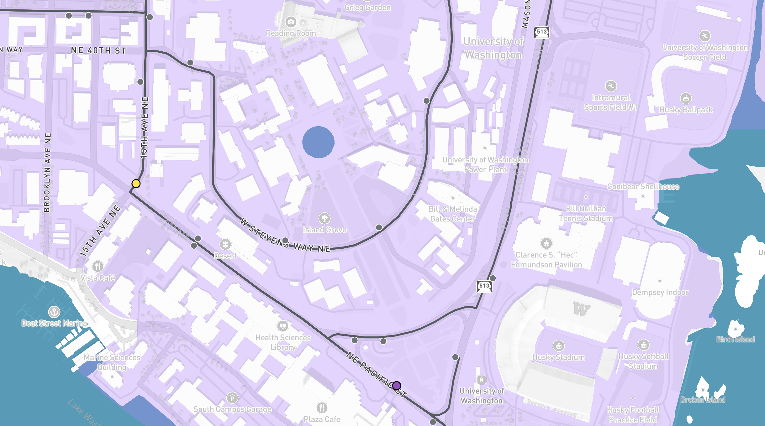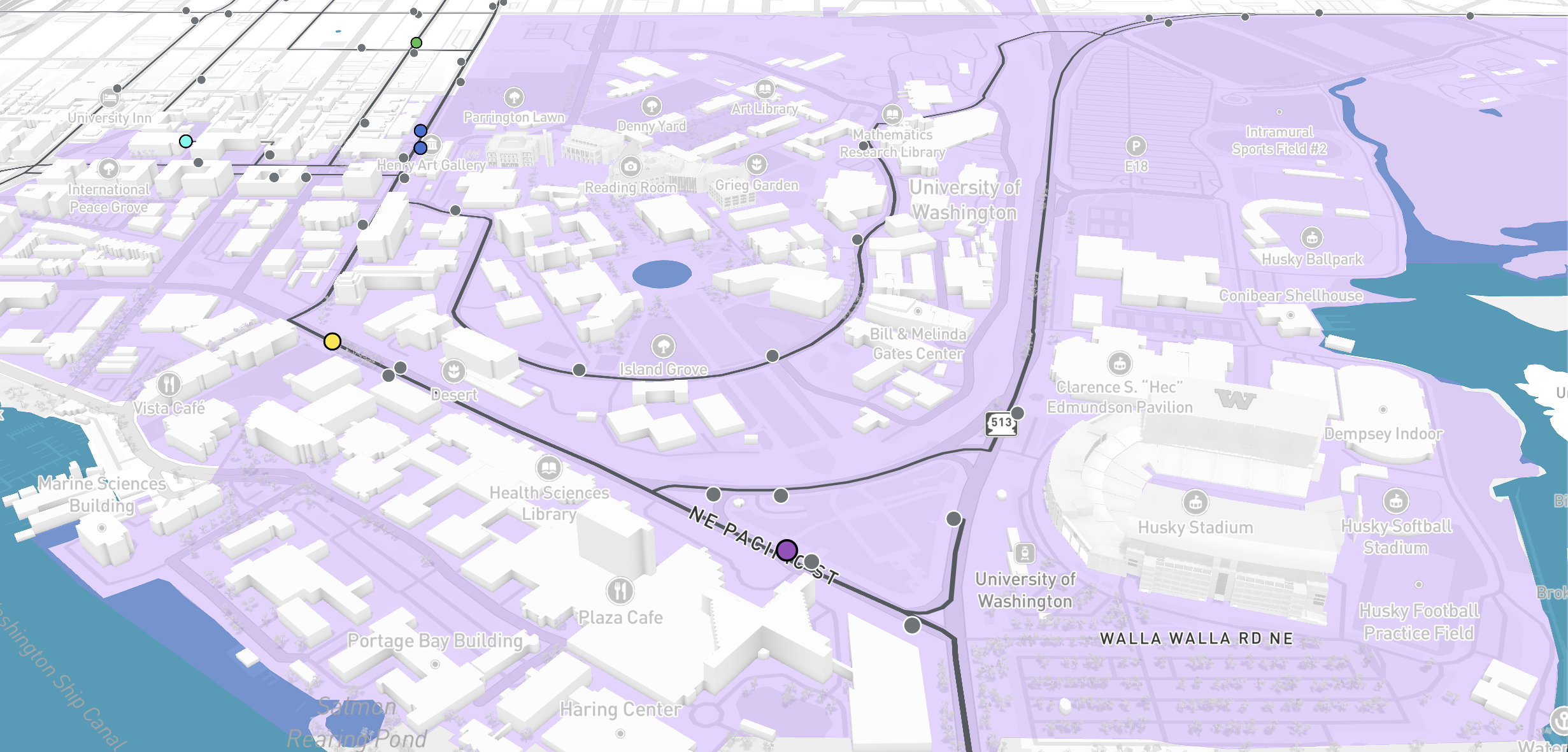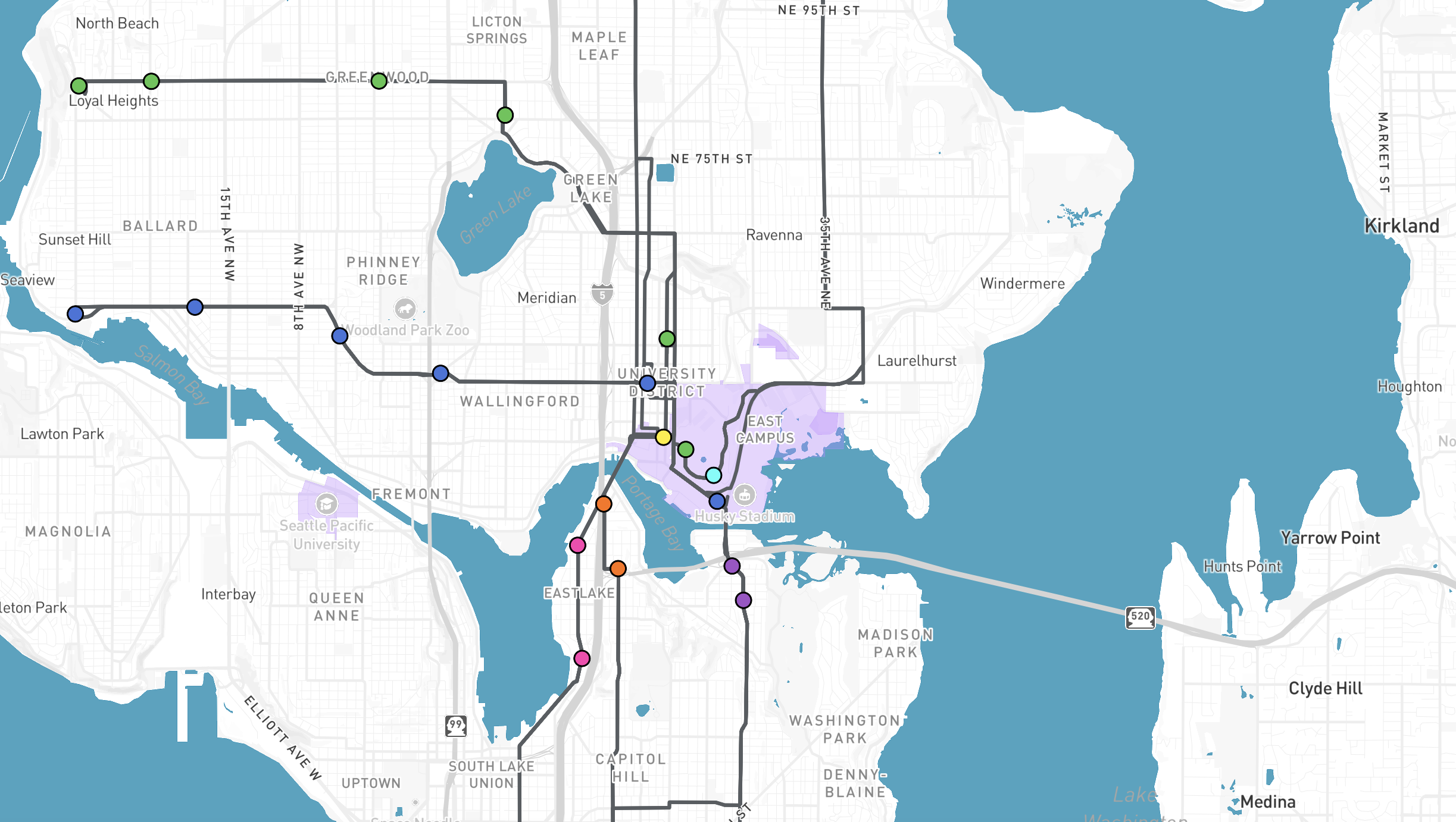 When users first load the web map, they will see a map consisting of a custom basemap centered over UW Seattle and the University District, featuring the 8 bus routes listed above.