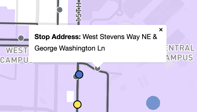 On the bus routes, moving circles represent the current positions of buses on the routes. The positions of these circles are updated every 7 seconds. The moving buses display a pop-up that shows their route number, headsign(s), and label when clicked. This pop-up tracks the position of the bus.