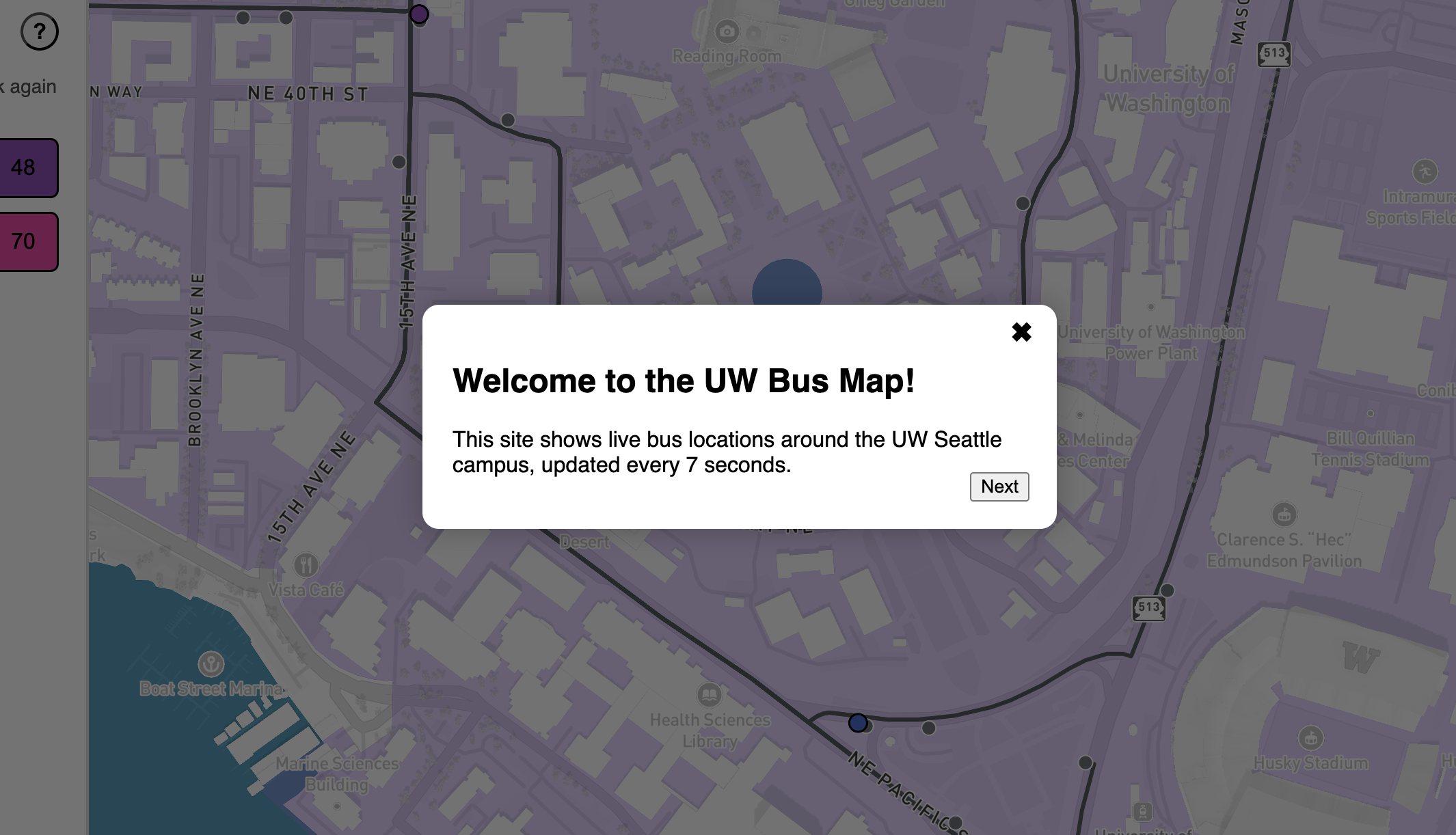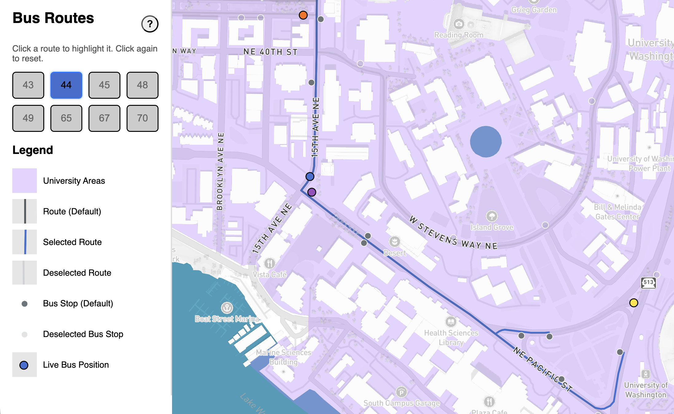 For our final project in GEOG 328, we decided to make a web map showing live-updating positions of buses in Seattle, specifically those that go to and from UW. We chose to display the following routes: 43, 44, 45, 48, 49, 65, 67, and 70. The position data comes from the authoritative source for real-time data, King County Metro.